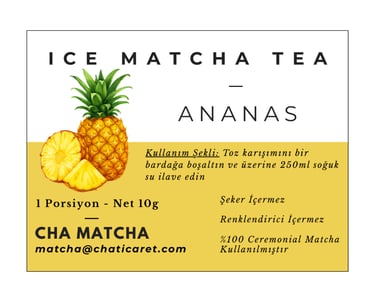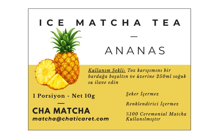 Sadece toz karışımının üstüne 250ml soğuk su ekleyin ve Ananas aromalı Ice Matcha Tea'niz hazır. Rengini doğal matcha renginden alır. Şeker ve renklendirici içermez.