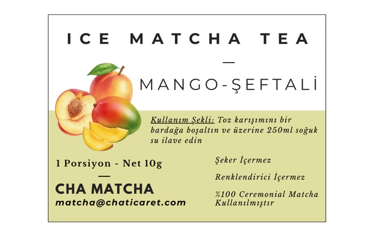 Sadece toz karışımının üstüne 250ml soğuk su ekleyin ve Mango ve Şeftali aromalı Ice Matcha Tea'niz hazır. Rengini doğal matcha renginden alır. Şeker ve renklendirici içermez.